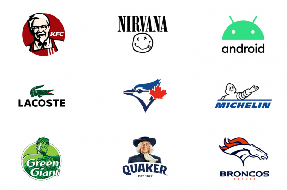 吉祥物徽標(biāo)示例包括:肯德基、涅盤、Android、拉科斯特、多倫多藍(lán)鳥隊(duì)、米其林、綠巨人、貴格會(huì)和丹佛野馬隊(duì)。